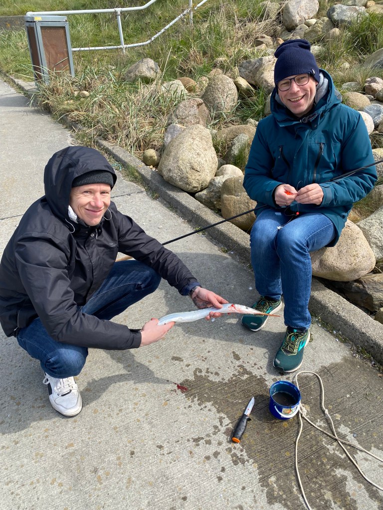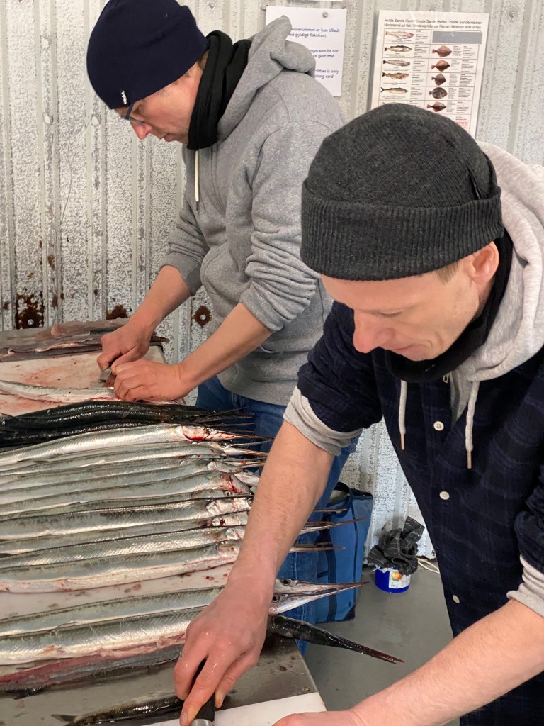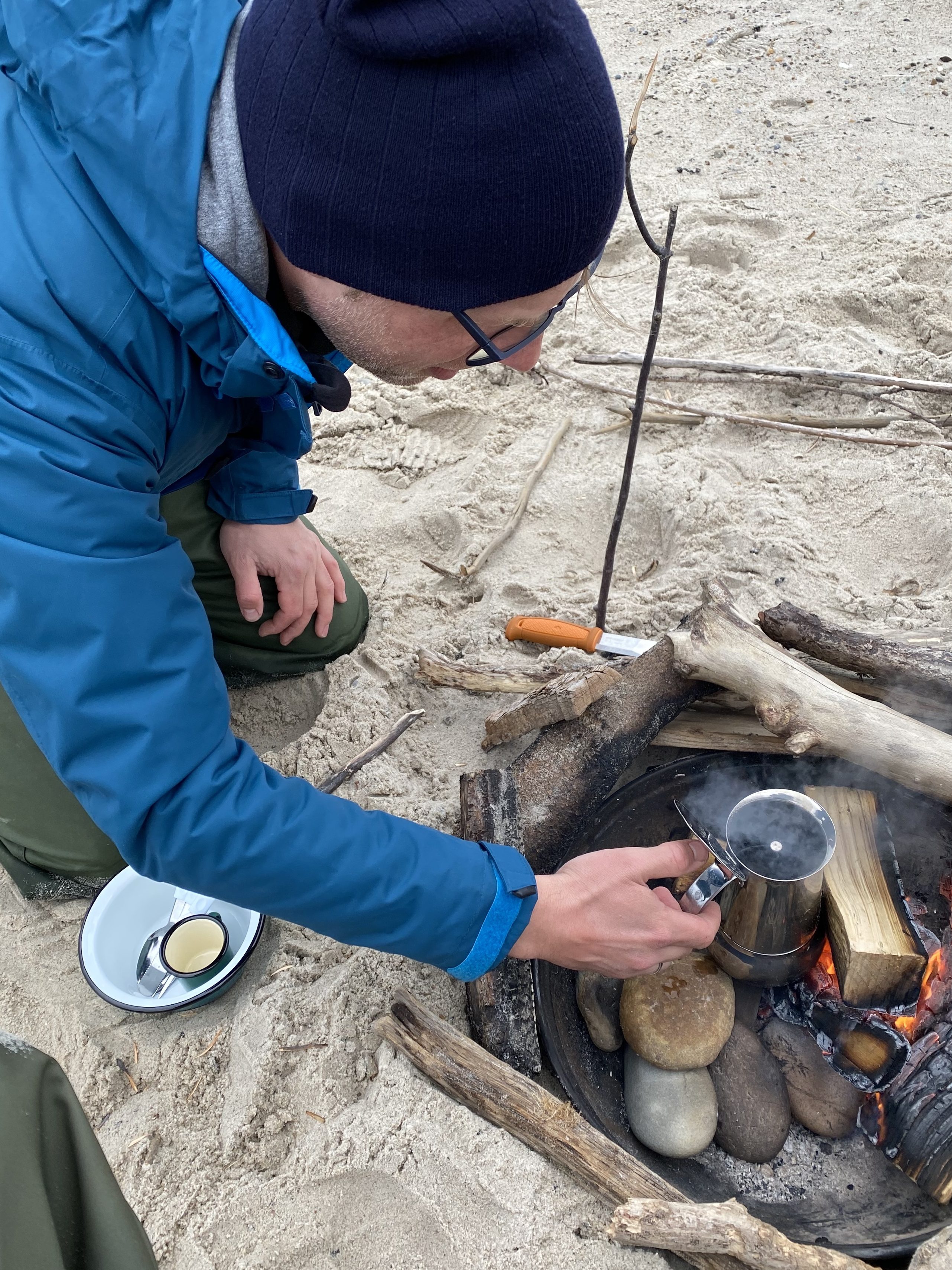 Wir verbringen dreieinhalb Tage gemeinsam beim Angeln, Feuer machen und leckerem Essen am Strand. Wir buddeln Lachs ein und aus, fangen und filetieren bis spät in die Nacht Hornhechte, erwischen genau einen Hering und eine Flunder. Wir verbringen viele Stunden draußen im stürmischen Wind, stehen mit der Wathose in der glatten See und räuchern am Feuer ganz ungeplant unsere Jacken.